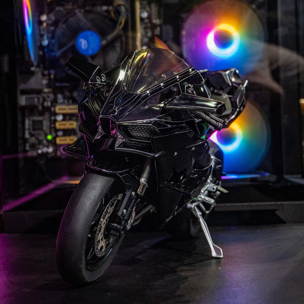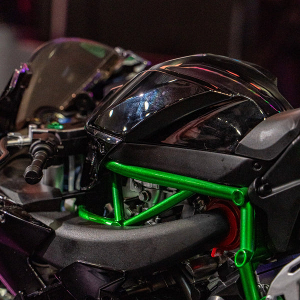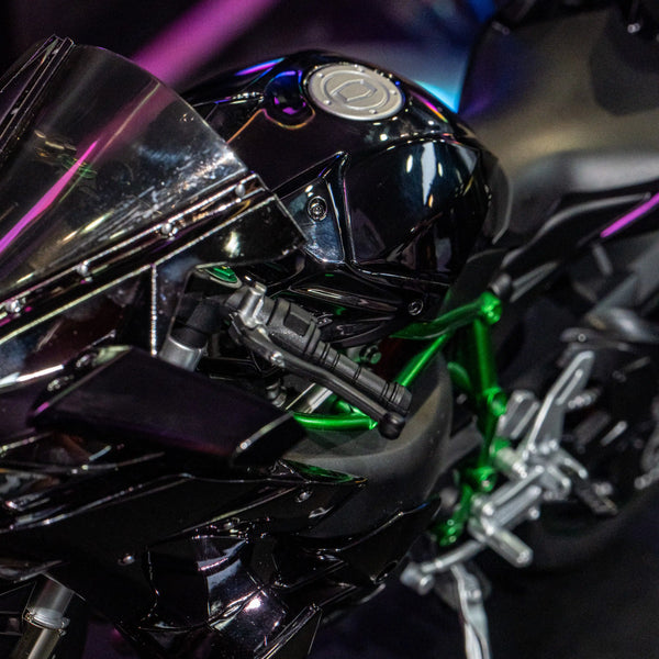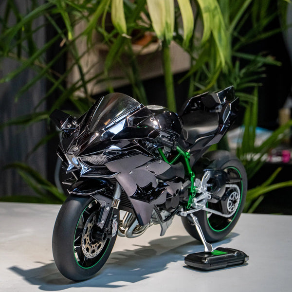 โมเดล Kawasaki Ninja H2R ขนาด 1:6 ผลิตอย่างพิถีพิถัน เลียนแบบรถมอเตอร์ไซค์คาวาซากิในตำนานได้อย่างสมบูรณ์แบบ ด้วยขนาด ความยาว 33 ซม. กว้าง 13 ซม. และสูง 17 ซม. จึงให้ความรู้สึกสมจริงราวกับรถมอเตอร์ไซค์ขนาดเล็กลง
