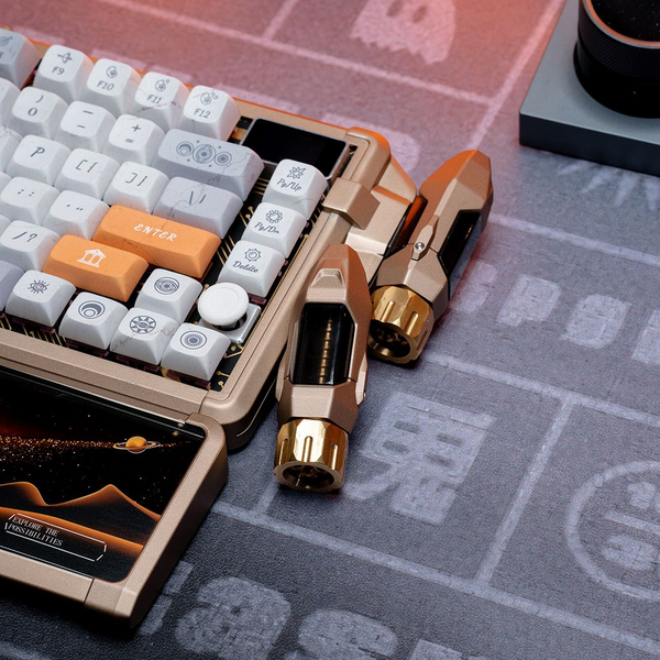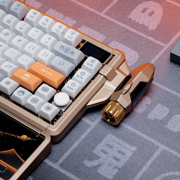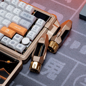 จอยสติ๊กห้าทิศทางและจอ LCD ช่วยให้ หน้าจอ LCD คมชัด รองรับฟังก์ชันต่างๆ เช่น การควบคุมระดับเสียง การแสดงเวลา หรือการแสดงรูปภาพที่คุณอัปโหลด และคุณสามารถรีแมปจอยสติ๊กไปยังปุ่มใดก็ได้เพื่อเพิ่มประสิทธิภาพการทำงานของคุณ ทุกรายละเอียดได้รับการปรับปรุงและปรับแต่งเพื่อประสบการณ์ที่ดีที่สุดบนคีย์บอร์ด Mars 03 ธีมยานอวกาศนี้ แป้นหมุนแม่เหล็กคู่ KeysMe อันเป็นเอกลักษณ์—ทองแดงกัดด้วยเครื่อง CNC ผสมสังกะสีหล่อ—ติดตั้งเข้ากับรูปทรงจรวดขนาดกะทัดรัดด้านข้าง พร้อมแรงตึงที่แม่นยำเพื่อจุดประกายความคิดสร้างสรรค์ของคุณระหว่างการใช้งานบนโต๊ะเป็นเวลานาน